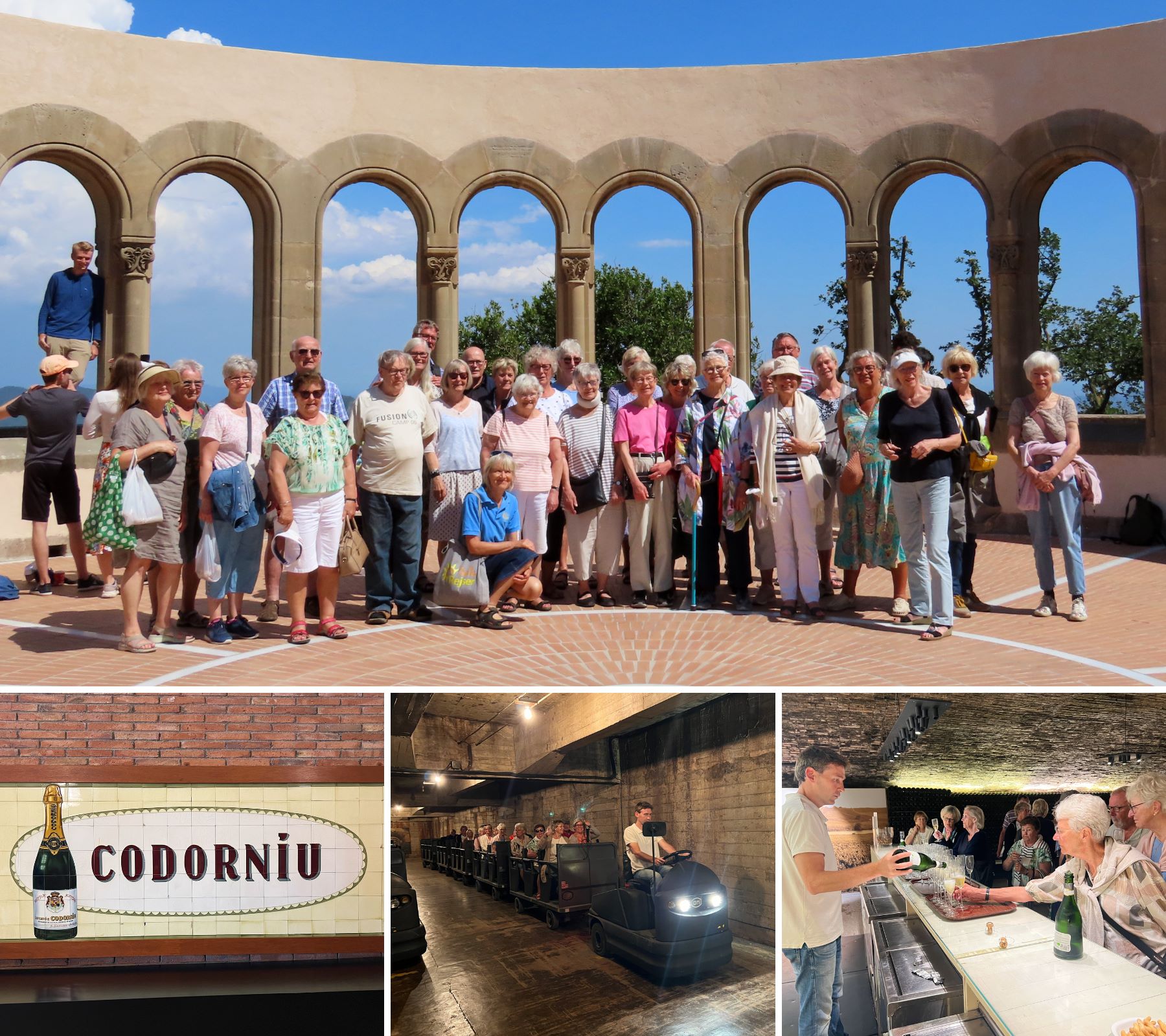 Det hele flettes ind i fortællinger om produktion af Spaniens mousserende vine, cava, mens vi kører 1,5 time til vingården Codorniu. Her ser vi en film om stedet og kører så rundt i små tog i nogle af de 30 km gange langt under jorden. De har 100 millioner flasker liggende ved 15-16 grader. Bagefter er der smagsprøver på to cavaer. En særdeles god start til et besøg i butikken. Der tales et øjeblik om grænser for kuffertvægt, men Bella Rejsers gæster er optimister. Det går nok.
