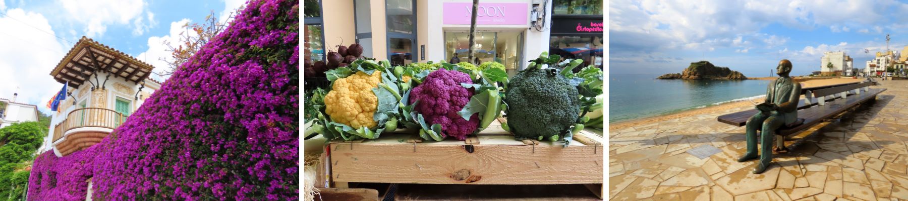 Der er café i parken og mange flere langs stranden i Blanes. På gågaden falder jeg tilfældigt over et stort grøntsagsmarked, hvor de lokale bønder sælger deres afgrøder. Det er jo lørdag. Mange af deres tomater og appelsiner er så store, at de kan passe min kasket. Og her er blomkål ikke bare hvide, men også gule og lilla. Verden er virkelig i farver i Catalonien.