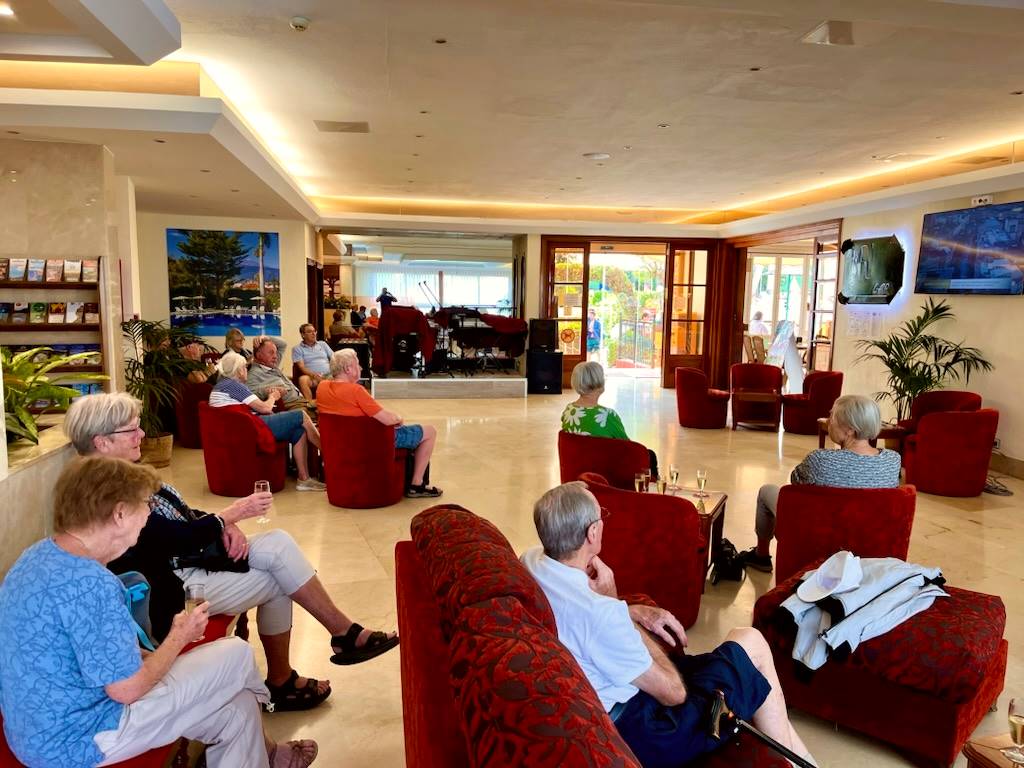 En del af gæsterne stryger direkte til hotellets storskærm for at se det hele fra start. Michael sørger for cava til! Længe leve ham også!