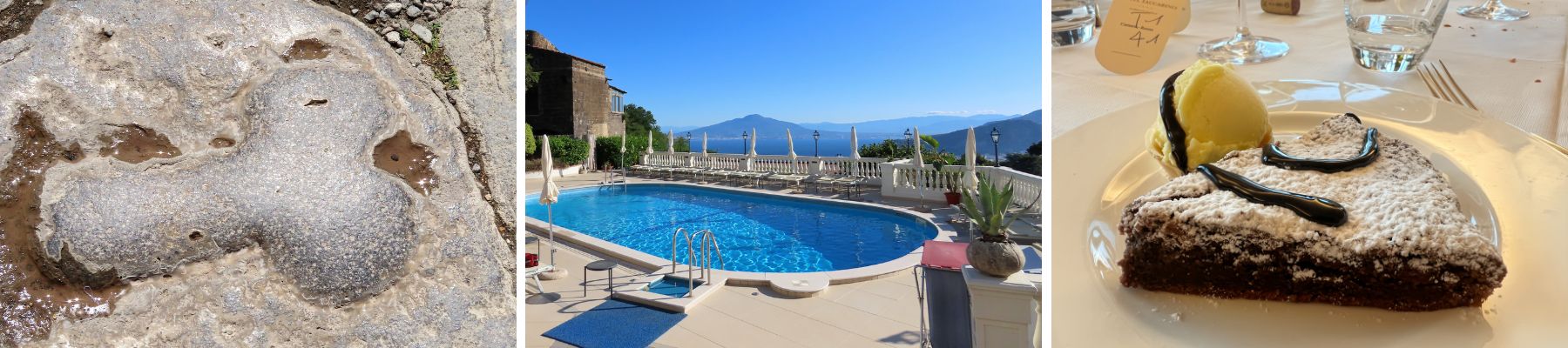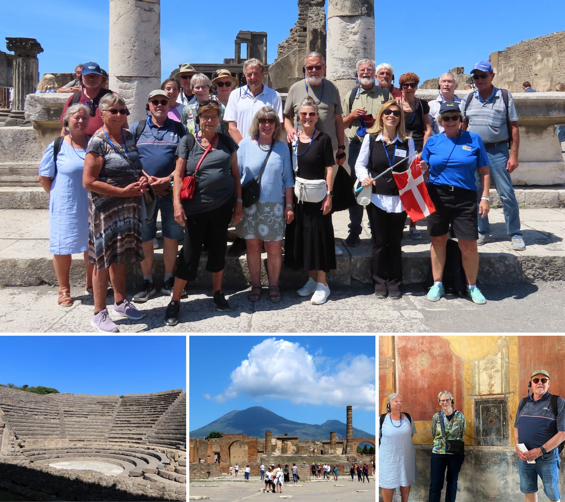 Det ville tage dagevis at se alt, men vi får et godt indtryk af Pompeji og stedets historie, før vi inviteres på frokost lige ved indgangen. Salat, pizza og kage. Og så hjem til poolen. Helle spillede musik og fortalte historier undervejs.