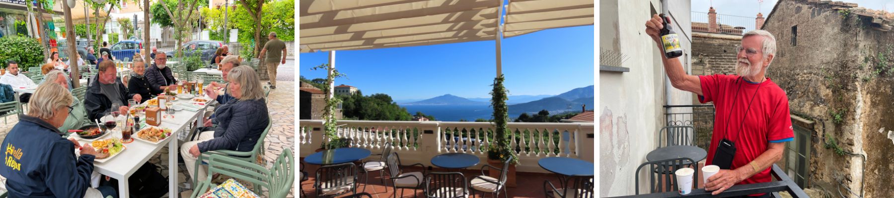 Snakken går om, hvad hver enkelt har lavet på fridagen. Vi hører om Herkulaneum og ser fotos af fantastiske malerier og mosaikker fra oldtiden. Og Helle har trods sin fridag inviteret på gåtur til det lokale kloster. Det har været en stor succes. Vejret var så klart, at de kunne se Capri. Og der blev hygget igennem på Orlandos bar oppe i byen. Sådan skal en fridag være.