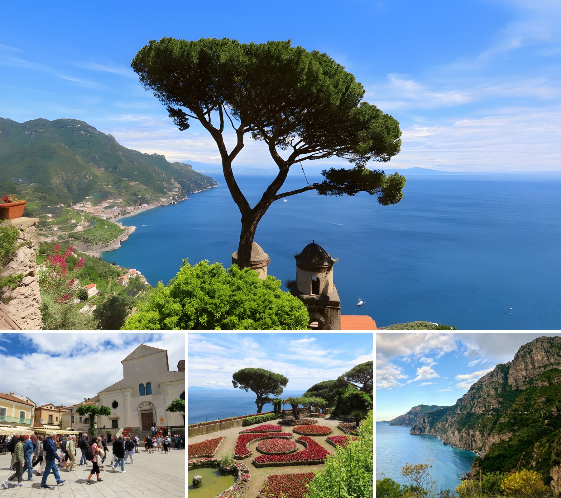 I Ravello venter endnu en god frokost - salat, pasta med aubergine og en kage med citroncreme. Jeg håber, min nye livrem er lang nok. Ude igen er skyerne blæst væk. Himlen er blå, bjergene står frodigtgrønne, og de farverige bygninger på kirketorvet stråler. Nu kører det for alvor.