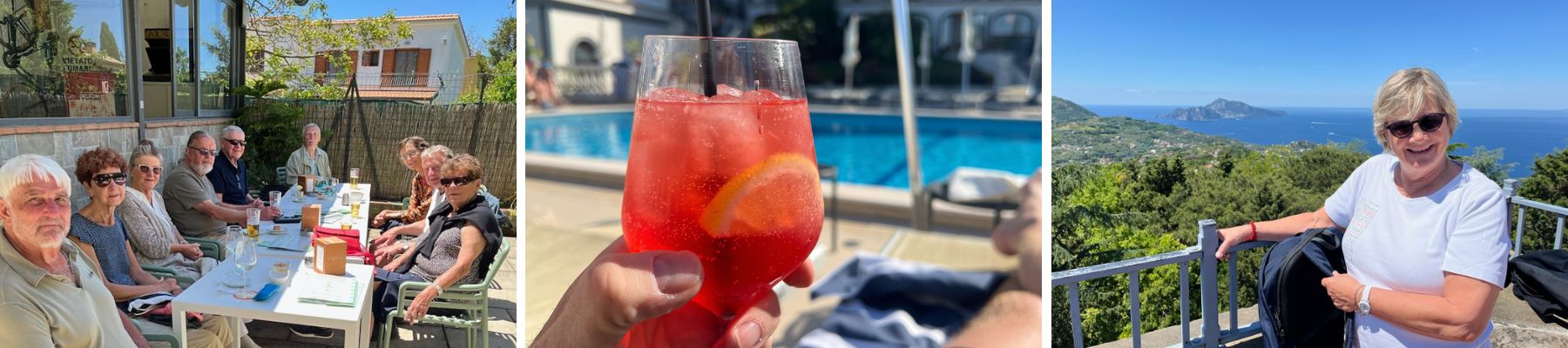 Der hygges på terrassen før informationsmødet, hvor vi nyder et glas prosecco med juice. Så går vi en lille tur i den lokale by Sant’Agata. Helle udpeger busstation, butikker, turistkontor, byens bedste konditori og bar, det hyggelige kirketorv og meget mere. Vi får også anvist stien ned til Sorrento og vejen op til det lokale kloster. Så kan vi selv vælge alt efter humør.