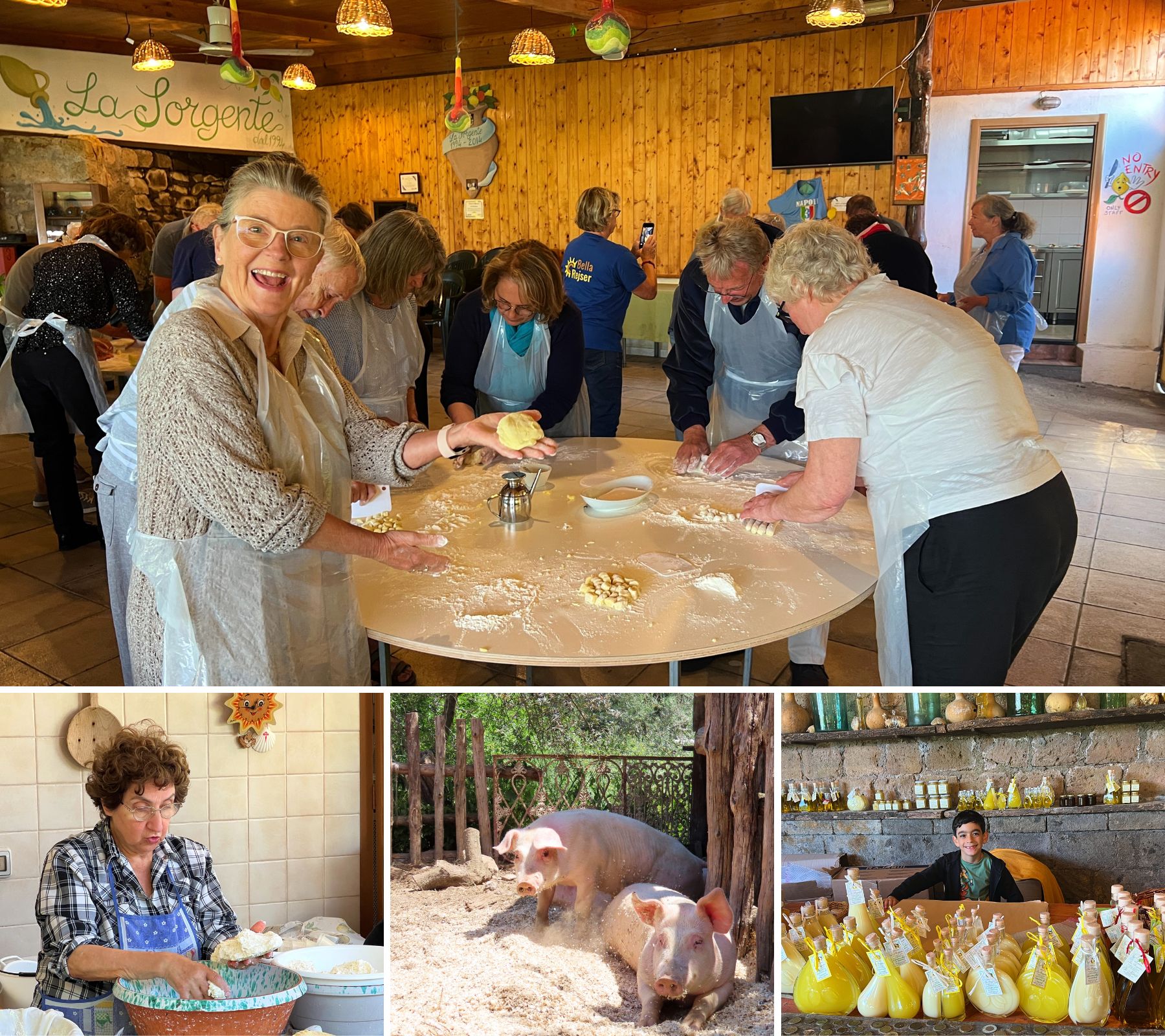 Der skal laves gnocchi. Og her må vi hellere lige få udtalen på plads: njokki. Endelig ikke gnåtji. Således beriget med italiensk for begyndere går vi til opskriften. Der skal pilles kogte kartofler, som moses og tilsættes salt og olie. Nu æltes mel i lidt ad gangen. Når dejen ikke klistrer mere, formes den til pølser og skæres ud for at blive kogt. Alle går til arbejdet med stor entusiasme. Kokkeskoler gør altså noget ved fællesskabet.